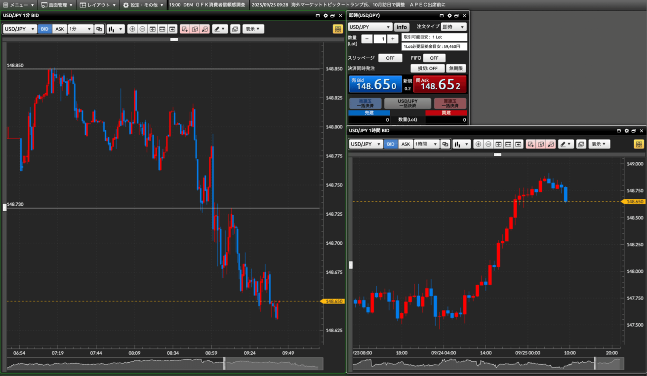 友人にリモートで教えてもらいながら、DMM FXのチャートや取引画面を少し触ってみた感じ、UIは見やすいし直感的に使える印象。お金が増えたり減ったりするのが楽しいですね。
